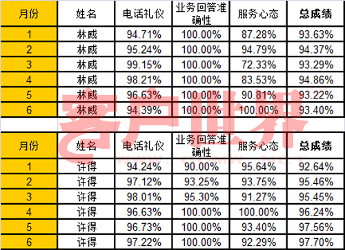 上面這兩張表格,是兩位員工的質(zhì)檢分?jǐn)?shù),從今年一月份開始,一月到六月每個(gè)月的質(zhì)檢分?jǐn)?shù),你看到有總分,還有三個(gè)分項(xiàng)的成績(jī)。請(qǐng)問(wèn),林威是新員工,還是許得是新員工?我們下一期公布答案。