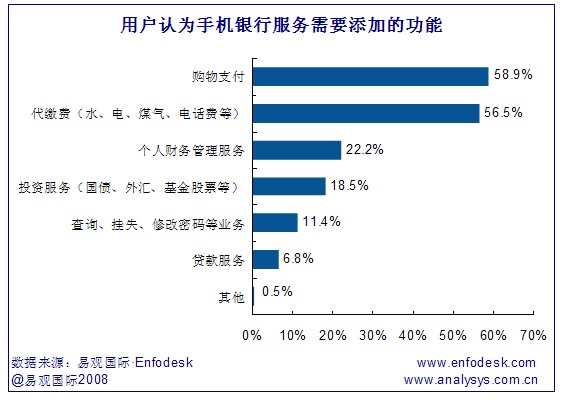 《2008年中國個(gè)人網(wǎng)上銀行市場用戶調(diào)研報(bào)告-手機(jī)銀行》研究發(fā)現(xiàn),用戶認(rèn)為手機(jī)銀行需要添加的功能主要為購物支付和代繳費(fèi),分別占58.9%和56.5%。