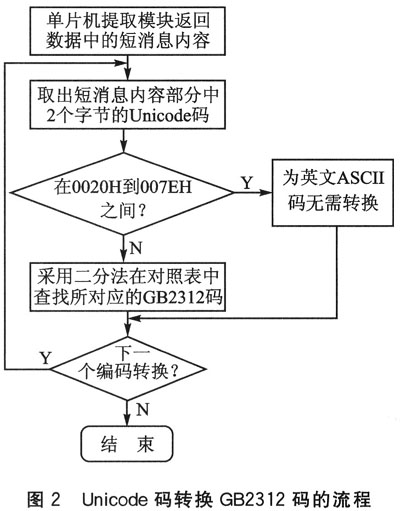 單片機(jī)通過(guò)串口與模塊連接后,發(fā)送讀取第一條新短消息指令:“AT+CMGR=1”。提取模塊接收的短消息后,先判斷其內(nèi)容是否為ASCII碼。若為ASCII碼,則無(wú)需轉(zhuǎn)換直接讀。环駝t,通過(guò)查表法查找其對(duì)應(yīng)的漢字GB碼,實(shí)現(xiàn)不同編碼間的轉(zhuǎn)換。轉(zhuǎn)換流程如圖2所示。