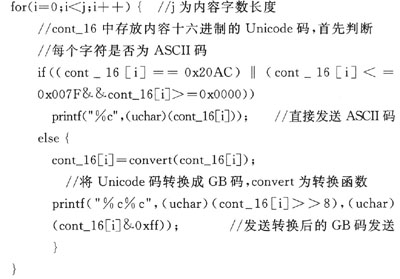 經(jīng)研究比較發(fā)現(xiàn),所要提取的短信信息包括手機(jī)號(hào)碼、時(shí)間和短信內(nèi)容。在Text模式下時(shí)間和日期均為ASCII碼,可直接讀取,只需將內(nèi)容中漢字部分的Unicode碼轉(zhuǎn)換成國(guó)標(biāo)碼;而在PDU模式下除漢字編碼轉(zhuǎn)換外,還需將號(hào)碼、時(shí)間部分編碼進(jìn)行兩兩顛倒的轉(zhuǎn)換,才能得到所需的正確信息。故在系統(tǒng)設(shè)計(jì)中將GSM模塊設(shè)為T(mén)ext模式,更能簡(jiǎn)化程序設(shè)計(jì)。