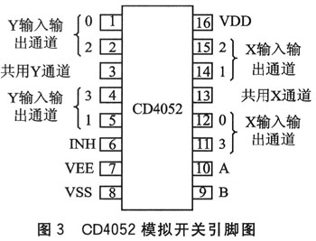 51系列單片機(jī)一般只有一個(gè)串行通路,通過(guò)串口與GSM模塊連接后,則不能再連接其他串口設(shè)備;而一些串口擴(kuò)展芯片成本較高,連接也較麻煩。本方法利用數(shù)控模擬開(kāi)關(guān)CD4052來(lái)做多串口擴(kuò)展器,成本低廉而且接線簡(jiǎn)單。其引腳排列如圖3所示。