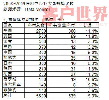 根據(jù)Data Monitor公司近年的分析報告,12呼叫中心大國在2008~2009年度共有呼叫中心座席580萬個,其中公共事業(yè)類呼叫中心座席54萬個,占9.3%。