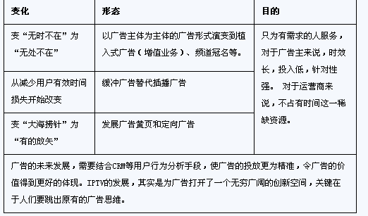 IPTV在短期內(nèi)的屬性還著重于電視媒體,在收入上偏向于后向媒體模式,通過用戶的流量來帶動后向廣告價(jià)值。借助IPTV的互動特性和頻道資源的豐富性,以空間來換取稀缺的時(shí)間資源。