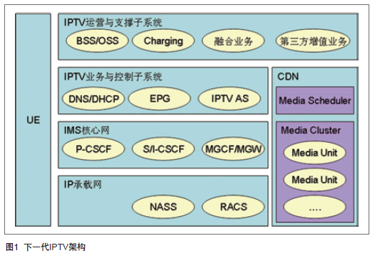 下一代IPTV架構(gòu)按功能屬性總體上劃分為UE、IPTV運(yùn)營與支撐子系統(tǒng)、IPTV業(yè)務(wù)與控制子系統(tǒng)、CDN內(nèi)容分發(fā)網(wǎng)絡(luò)、IMS核心網(wǎng)和IP承載網(wǎng)五個子系統(tǒng),如圖1。