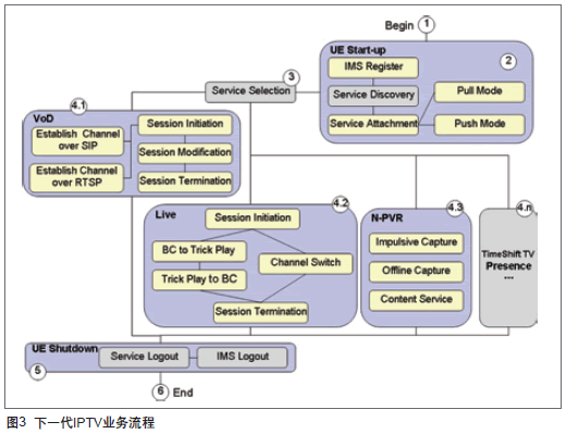 基于網(wǎng)絡(luò)視訊框架的下一代IPTV的業(yè)務(wù)流程具有完整的生命周期,其生命周期始于UE開機(jī)階段,活躍于業(yè)務(wù)使用階段,終止于UE關(guān)機(jī)階段,如圖3。其細(xì)分的業(yè)務(wù)流程包含以下6個子階段: