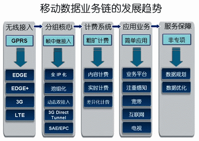 回顧現(xiàn)代通信走過的歷程,當(dāng)數(shù)字通信技術(shù)出現(xiàn)的時候,通信普及成本大幅度下降,于是更多的人得以享受電話通信的便利,人類也由此進(jìn)入了數(shù)字通信時代;移動電話的出現(xiàn)和普及,使人們可以隨時隨地進(jìn)行溝通,引領(lǐng)我們步入移動通信時代;基于IP技術(shù)的互聯(lián)網(wǎng)的興起,進(jìn)一步拓展了人類通信的廣闊空間,創(chuàng)造了新的通信手段,使我們步入了互聯(lián)網(wǎng)通信時代;寬帶技術(shù)的成熟和廣泛部署,賦予了基于包交換的通信方式更強(qiáng)的數(shù)據(jù)傳送能力,開創(chuàng)了人類的數(shù)據(jù)通信時代。圖1 移動數(shù)據(jù)業(yè)務(wù)鏈的發(fā)展趨勢