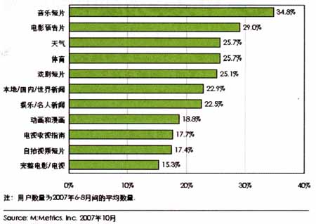 M:Metrics針對(duì)美國(guó)手機(jī)用戶的研究數(shù)據(jù)顯示,美國(guó)手機(jī)用戶在訂閱手機(jī)電視內(nèi)容時(shí)偏愛娛樂類的內(nèi)容,其中音樂短片、電影預(yù)告片是用戶需求最大的手機(jī)電視內(nèi)容,另外受到歡迎的是與生活相關(guān)的內(nèi)容及新聞內(nèi)容。