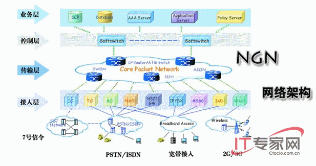下一代網(wǎng)絡(luò)(NGN)是指以軟交換為代表,IMS為核心框架,能夠?yàn)楣婌`活提供大規(guī)模視訊話音數(shù)據(jù)等多種通信業(yè)務(wù),以分組交換為業(yè)務(wù)統(tǒng)一承載平臺,傳輸層適應(yīng)數(shù)據(jù)業(yè)務(wù)特征及帶寬需求,與通信運(yùn)營商相關(guān),可運(yùn)營、維護(hù)、管理的通信網(wǎng)絡(luò)。