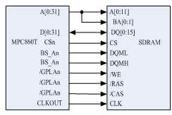 嵌入式網絡視頻服務器是一種提供網絡視頻傳輸和共享的嵌入式設備,是為構建高可靠性的多媒體數字監(jiān)控系統(tǒng)而設計開發(fā)的,廣泛應用于分布式的安全監(jiān)控、交通監(jiān)控和工業(yè)監(jiān)控以及家庭監(jiān)控、視頻會議、可視電話等眾多領域。每個網絡視頻服務器都有自己的IP地址和網絡接口,可隨時隨地直接接入網絡,獨立工作,無需專用軟件、專人管理,必將成為未來數字化監(jiān)控系統(tǒng)的發(fā)展趨勢。圖4 SDRAM與MPC860T的連接框圖