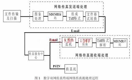 實現(xiàn)完整網絡傳真收發(fā)的功能與步驟,可以分為網絡傳真發(fā)送處理及網絡傳真接收處理兩個部分。其中網絡傳真接收端的處理可以理解為網絡傳真發(fā)送處理的逆過程。
