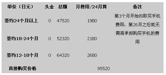 我們都知道日本的購買手機最主要是和運營商簽約購買,我們以夏普2009年夏季最新款手機Soft Bank 933SH為例,來說明一下在日本購買手機的成本?偟膩碚f,就是簽約時間越長,購買手機價格越低,簽約時間越短,購買價格越高。