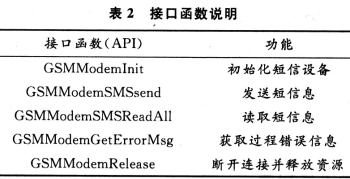 短信貓通過RS 232串口與計算機(jī)連接,系統(tǒng)需通過接口驅(qū)動短信貓發(fā)送或讀取短信,各接口函數(shù)說明見表2。