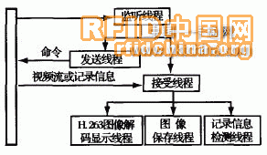 在軟件設(shè)計(jì)方面包括兩部分,一部分是監(jiān)控終端的監(jiān)控軟件,另一部分是各便件的底層軟件。監(jiān)控終端采用了多線程的軟件設(shè)計(jì)方法,系統(tǒng)對(duì)連接的每一個(gè)監(jiān)控點(diǎn)共采用了6個(gè)線程,即網(wǎng)絡(luò)監(jiān)聽線程、發(fā)送線程、接受線程、H.26 3圖像解碼顯示線程、圖像保存線程和記錄信息(門口終端的撥號(hào)、門禁一卡通等記錄信息)檢測(cè)線程,如圖4所示。