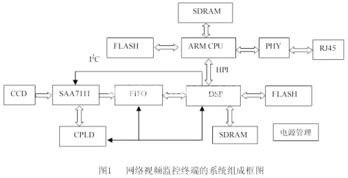為實(shí)現(xiàn)視頻實(shí)時(shí)檢測以及網(wǎng)絡(luò)傳輸功能,本監(jiān)控終端采用ARM+DSP的體系框架,系統(tǒng)組成如圖1所示,主要包括以ARM S3C4510B為核心的主控兼網(wǎng)絡(luò)傳輸模塊,以SAA7111為核心的視頻采集模塊,以DSP