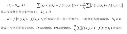 敏感項(xiàng),α為抑制系數(shù),N為檢測區(qū)域內(nèi)的像素?cái)?shù)目。采用這種塊比較法,閾值取值范圍大大減小,易于確定,而且對運(yùn)動(dòng)目標(biāo)的大小也有一定的選擇性。在檢測每一子塊圖像是否發(fā)生變化時(shí),引入光照敏感項(xiàng),避免了因光照變化引起的虛警。這種方法對光線變化有一定的自適應(yīng)性,擴(kuò)展了系統(tǒng)的動(dòng)態(tài)適用范圍。