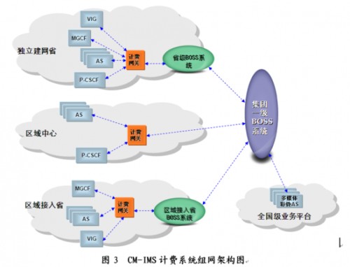 為了降低設(shè)備投資風(fēng)險(xiǎn),CM-IMS在部署初期采用分省和區(qū)域中心相結(jié)合的組網(wǎng)方案,并設(shè)置全國級業(yè)務(wù)平臺。CM-IMS計(jì)費(fèi)系統(tǒng)組網(wǎng)架構(gòu)如圖3所示。