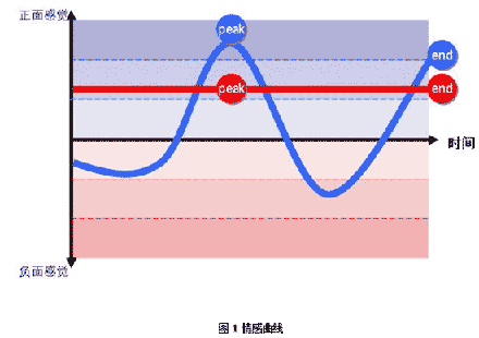 諾貝爾獎得主心理學(xué)家Daniel Kahneman發(fā)現(xiàn)人們在一次體驗(yàn)中只會記住兩件事:峰值感受(流程中最好或最差的一點(diǎn))以及終了感受。我運(yùn)用“峰值——終了規(guī)則”將每個子流程上的情感感受按照自然時間順序連成一根“情感”曲線,如圖1所示。