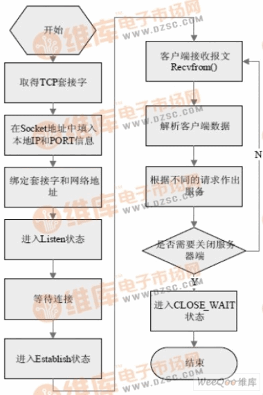 處理抽象。本應(yīng)用中需要派生一個(gè)QTcp 類,實(shí)現(xiàn)傳輸層的TCP 協(xié)議。一般基于 TCP 的網(wǎng)絡(luò)應(yīng)用程序都要繼承QTcp 類,然后在ESTABLISHED 狀態(tài)中添加 子狀態(tài)完成特定的功能。在服務(wù)器端,利用量子框架實(shí)現(xiàn)一個(gè)QServer 類,是一個(gè)活動對象,繼承自QTcp 類。QServer 活動對象同客戶端TCP Socket 連接后,進(jìn)入ESTABLISHED狀態(tài)中,通過調(diào)用Recvfrom 函數(shù)接收客戶端的請求,然后解析請求的服務(wù)類型,根據(jù)不同請求做出不同的服務(wù)。其軟件流程圖如圖1 所示: