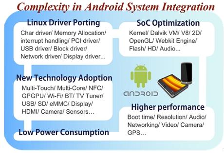對(duì)廠商而言,開發(fā)一款A(yù)ndroid設(shè)備,不僅僅只是將所有零組件組合成為一個(gè)產(chǎn)品那么容易,最大的學(xué)問(wèn)便在于將系統(tǒng)單芯片(System-on-a-chip,SoC)、各種新技術(shù)和Android系統(tǒng)進(jìn)行整合,SoC涉及像是Dalvik Virtual Machine、OpenGL、V8、Webkit Engine等上層的演算,與Android間的結(jié)合便必須透過(guò)不斷的嘗試與驗(yàn)證,才能研發(fā)出既符合成本效益、又有良好效能的優(yōu)化產(chǎn)品。目前市面上有些SoC廠商已針對(duì)Android系統(tǒng)的特性,提供整合過(guò)的SoC平臺(tái),將藍(lán)牙、相機(jī)或上網(wǎng)等常用功能模組預(yù)先寫入,減少終端成品廠商費(fèi)力整合開發(fā)的時(shí)間,但對(duì)廠商而言,這樣的預(yù)先整合是否適合自身產(chǎn)品,以及是否需要再作更細(xì)致的修改,則又是更困難的課題。