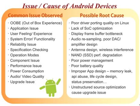 盡管Android系統(tǒng)的普及看似指日可待,但在實(shí)際的產(chǎn)品應(yīng)用上,也有其可能產(chǎn)生的問(wèn)題風(fēng)險(xiǎn)。Android作為一個(gè)開放式的操作系統(tǒng),是Google提供廠商的操作系統(tǒng)參考架構(gòu)(reference design),廠商能有充足的發(fā)揮空間,以Android為基礎(chǔ)向上開發(fā)設(shè)計(jì)自家產(chǎn)品,但也因?yàn)檫@樣的開放性與自由性,讓廠商在軟硬件結(jié)合的這個(gè)環(huán)節(jié)必須下更大的功夫,像是如何挑選合適的硬件包括基頻處理器、通信芯片、觸控感應(yīng)芯片、天線與存儲(chǔ)器模組等,以及如何調(diào)整出最適當(dāng)?shù)能浖O(shè)定等,更重要的是如何將軟硬件整合,開發(fā)出差異化的產(chǎn)品。這中間所有的細(xì)節(jié)都會(huì)對(duì)產(chǎn)品最終樣貌產(chǎn)生莫大的影響,像是其功能的完整度、使用接口的設(shè)計(jì)、效能表現(xiàn)(例如觸控滑動(dòng)畫面、開啟程序所需時(shí)間)、品質(zhì)可靠度、甚至是后續(xù)的固件升級(jí)動(dòng)作等等。在此百佳泰便試圖以專業(yè)中立的測(cè)試實(shí)驗(yàn)室角度,來(lái)點(diǎn)出廠商應(yīng)用Android于手機(jī)、平板電腦或其他設(shè)備時(shí)應(yīng)注意的開發(fā)重點(diǎn),以希冀作為一個(gè)有效的參考資訊。