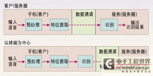 3G手機(jī)的ASR應(yīng)用設(shè)計可分為兩類,即以終端為中心和以客戶/服務(wù)器為中心的應(yīng)用。如圖1所示為以終端為中心的設(shè)計方法,3G手機(jī)(終端)執(zhí)行整個語音識別過程并送出識別結(jié)果。在圖2所示的客戶/服務(wù)器方法中,終端只是執(zhí)行預(yù)處理特征提取,然后通過一個誤碼受保護(hù)的數(shù)據(jù)信道將這些參數(shù)發(fā)送給中心服務(wù)器,中心服務(wù)器最終完成語音識別。如果采用以客戶/服務(wù)器為中心的設(shè)計方法,3G手機(jī)應(yīng)使用數(shù)據(jù)信道而非移動信道來將語音發(fā)送給服務(wù)器進(jìn)行識別,因為移動信道所用的低速率語音編碼會嚴(yán)重影響語音識別的性能。
