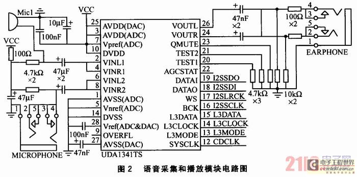 語音采集和播放模塊的作用是將音頻模擬信號轉換為數(shù)字信號,并對信號進行PCM編碼。其電路如圖2所示。采用Philips公司的UDA1341 TS型立體聲音頻CODEC進行音頻編解碼。該芯片提供2個麥克風輸入,可實現(xiàn)單端輸入、差分輸入等靈活配置,并設置了可編程增益放大器和自動增益控制器,可保證高質量的音頻獲。煌瑫r,還集成了聽筒和喇叭輸出的驅動器,喇叭音量可以通過編程調整。S3C2440A-40微處理器與UDA1341TS編解碼器通過I2S總線直接相連,并采用DMA發(fā)送/接收方式,完成系統(tǒng)的錄音和放音。