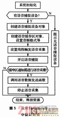 從音頻編解碼器中獲取數(shù)據(jù)時,首先通過UDA1341TS采集語音信號放入語音捕捉緩存區(qū),應用程序再從語音捕捉緩沖獲取語音信號并發(fā)送。具體程序流程如圖5所示。