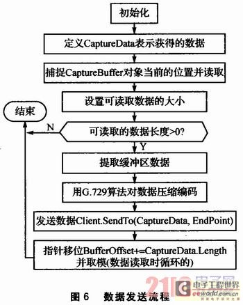 數(shù)據(jù)發(fā)送函數(shù)的作用是將語音捕捉緩沖區(qū)的數(shù)據(jù)通過Client.SendTo(CaptureData,EndPoint)函數(shù)發(fā)送到網(wǎng)絡上。當線程發(fā)現(xiàn)有數(shù)據(jù)要讀取(即線程被觸發(fā))時,就會循環(huán)調用數(shù)據(jù)發(fā)送函數(shù),直到?jīng)]有可讀的數(shù)據(jù)為止。CaptureBuffer為語音捕捉緩沖區(qū)對象。數(shù)據(jù)發(fā)送流程如圖6所示。