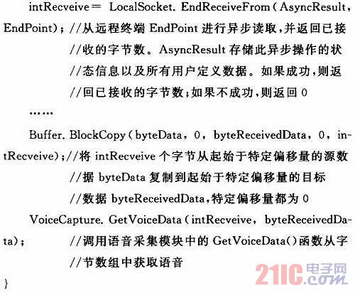 數(shù)據(jù)接收函數(shù)的功能主要是調用GetVoiceData()函數(shù)從網(wǎng)絡中接收語音數(shù)據(jù)并放入緩沖區(qū)。代碼如下: