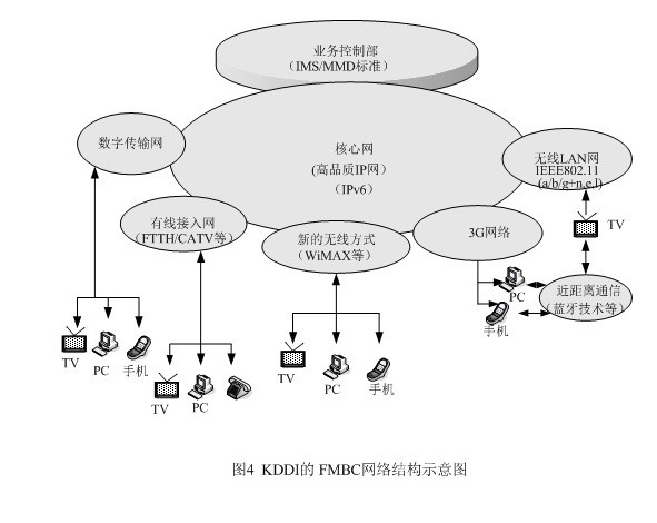為了在市場競爭中立于不敗之地,KDDI另辟稀徑,提出了將固定網(wǎng)、移動網(wǎng)、因特網(wǎng)和電視廣播相融合的概念,它與朝日新聞、朝日電視簽署合作框架,就是它的集中代表。FMBC是超3G的構(gòu)想,是以移動通信為基礎(chǔ),與固定電話網(wǎng)及因特網(wǎng)進行融合,現(xiàn)在又把廣播電視納入,這樣它就成了KDDI的NGN了。FMBC的網(wǎng)絡(luò)結(jié)構(gòu)請見圖4。從圖4上不難發(fā)現(xiàn)NGN的影子,特別是業(yè)務(wù)控制部的設(shè)立,并采用ISM/MMD標準,將網(wǎng)絡(luò)與應(yīng)用分開,以利新業(yè)務(wù)的開拓,同時完成核心網(wǎng)的IP化,這些都是NGN的基本概念。