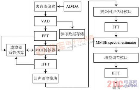 系統(tǒng)采用了頻域的MDF 自適應(yīng)濾波算法,將MMSE No ise Suppresso r 和多個VAD 添加到回聲消除器中。在加入濾波器系數(shù)更新模塊和非線性檢測模塊后,使得系統(tǒng)在更惡劣的噪音環(huán)境下以及雙方通話過程中,一樣具備良好的回聲消除和噪音消除能力。整個核心運(yùn)算部分均在頻率域內(nèi)完成,也大大降低了運(yùn)算量,最后通過調(diào)整DSP 的數(shù)據(jù)結(jié)構(gòu),合理運(yùn)用DSP 的資源和指令加速,實(shí)現(xiàn)了基于DSP 的高效能實(shí)時音頻處理器的設(shè)計(jì)。
