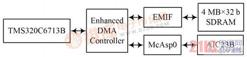 由于系統(tǒng)運(yùn)行過程中需要實(shí)現(xiàn)的算法較多,僅依靠TMS320C6713B 的192 KB片內(nèi)RAM 來執(zhí)行程序是很困難的。本文使用了EMIF 的接口擴(kuò)展了SDRAM 作為算法和數(shù)據(jù)的存儲區(qū)域。采用TLV320AIC23B 實(shí)現(xiàn)音頻輸入和輸出,AIC23 支持48 kHz 帶寬、96 kHz 采樣率的雙聲道立體聲A/ D,D/ A,音頻輸入包括了*輸入和線路輸入。