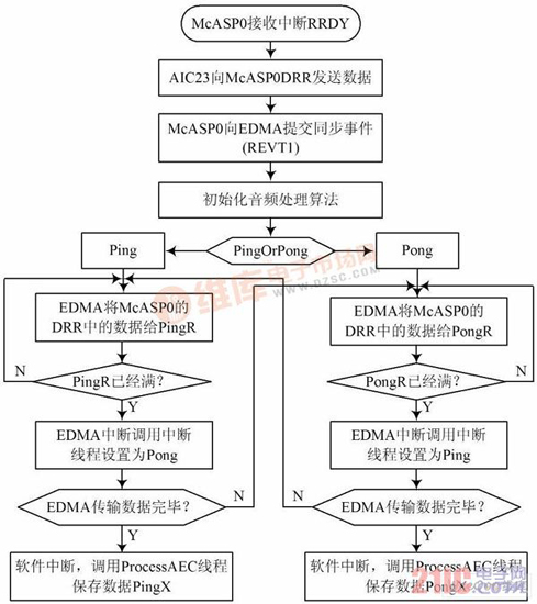 基于DSP 的實(shí)時處理的實(shí)現(xiàn),本文將AIC23 采集到的數(shù)據(jù)先存儲到SDRAM 中,在需要處理的時候利用EDMA 實(shí)現(xiàn)Ping Pong 緩沖,將待處理的數(shù)據(jù)分批搬運(yùn)到片內(nèi)存儲器,結(jié)合高速緩存和片內(nèi)內(nèi)存設(shè)計(jì)合適的數(shù)據(jù)結(jié)構(gòu),并將數(shù)據(jù)對齊,這樣大大減小了數(shù)據(jù)搬移帶來的開銷。