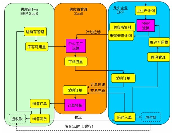 在線需求計劃管理。當龍頭完成企業(yè)內部的MRP運算后,便輸出“采購需求計劃”;該計劃作為供應鏈管理平臺,中心工廠(或稱虛擬企業(yè))運算的輸入,此刻供應鏈管理平臺可以動態(tài)地挖掘供應商的(ERP)的“庫存可用量”,并計算出“可供應量”,該數據可提供給龍頭企業(yè)編制“采購訂單”。