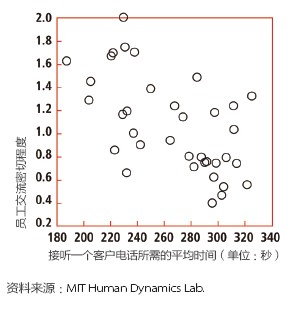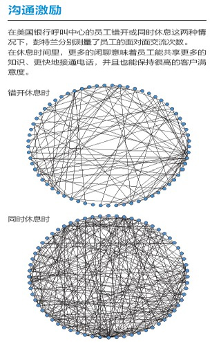 去年,彭特蘭的實(shí)驗(yàn)室與美國銀行(Bank of America)設(shè)在羅得島(Rhode Island)的呼叫中心合作,在80 名中心員工身上安裝了社會傳感器。這種傳感器看起來像一枚不顯眼的徽章,使用藍(lán)牙和紅外信號監(jiān)測實(shí)驗(yàn)對象每分鐘與哪些同事交談。測試活動先開展了一個月,后來又進(jìn)行了6周。第一個月后,實(shí)驗(yàn)室的研究人員發(fā)現(xiàn),與更多同事進(jìn)行過交談的員工能夠更快地接通電話,他們自我感覺的壓力也相對較小,而客戶滿意度卻與其他人一樣高。與刻板地遵循員工手冊或服從經(jīng)理的電子郵件指示相比,通過非正式的閑聊來交流問題和解決方案似乎能取得更好的結(jié)果。有了這種結(jié)論之后,該呼叫中心嘗試盡量將員工的休息時間安排在一起,而非像過去那樣錯開。這樣員工就有了更多的時間參與閑聊。幾個月后,美國銀行向?qū)嶒?yàn)室報告了結(jié)果:該呼叫中心獲得了相當(dāng)于每年1,500 萬美元的生產(chǎn)力提升。
