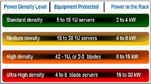 當(dāng)企業(yè)部署刀片式服務(wù)器來宿主其虛擬服務(wù)器時尤其如此。刀片式服務(wù)器采用多個即插即用型處理裝置,它們共享公共的電氣系統(tǒng)、電源、風(fēng)扇、電纜和存儲器。這樣的安排節(jié)省了數(shù)據(jù)中心的占地面積,簡化了硬件管理,并提高了IT靈活性。然而,這同時也大大增加了運算密度。結(jié)果,刀片式服務(wù)器產(chǎn)生大量的熱,從根本提高了機柜級供電要求。確實,一個典型的傳統(tǒng)服務(wù)器機柜可能需要4至6 kW電力,而一個典型的布滿刀片式機架的機柜則可能需要高達(dá)30 kW的電力,遠(yuǎn)遠(yuǎn)超過許多電源和冷卻系統(tǒng)的處理能力。