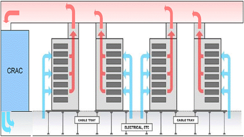 追求更低前期成本和更高運行效率的公司可以安裝被動式冷卻系統(tǒng)。它們的機殼上裝有一個氣密的后門和煙囪,用于收集來自服務(wù)氣的熱排風(fēng),并將其直接引導(dǎo)至CRAC裝置上的回風(fēng)管道中。然后,CRAC裝置對排風(fēng)進(jìn)行冷卻并重新循環(huán)。被動式系統(tǒng)要求機柜從前到后都具有較強的氣密性,以便與由CRAC裝置進(jìn)入的冷風(fēng)混合的服務(wù)器熱風(fēng)盡量少。通過比普通的熱-冷通道技術(shù)更徹底地分離冷風(fēng)和熱風(fēng),設(shè)計合理的被動式冷卻系統(tǒng)甚至能以低成本使灼熱的30kW服務(wù)器機柜在安全溫度下運行。