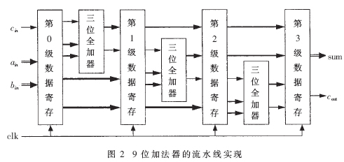 (2)針對(duì)不同運(yùn)算的位寬需要,設(shè)計(jì)專用的加法器和乘法器。本文對(duì)整數(shù)變換中的加法器采用三級(jí)流水線加法器,實(shí)現(xiàn)9位加法,每級(jí)流水線完成三位超前進(jìn)位加法,將邏輯延遲限制在三位加法器之內(nèi)。圖2給出了9位加法器的流水線實(shí)現(xiàn)框圖。選用EPF10K10LC84-3作為適配器件,經(jīng)過(guò)Synplify Pro 7.3綜合,結(jié)果表明這種加法器具有較優(yōu)的最高工作頻率和硬件開銷。如表2所示, 常規(guī)加法器的最高工作頻率為37.0MHz,消耗資源卻為28LC,而經(jīng)過(guò)優(yōu)化的三級(jí)流水線加法器在消耗資源增加不多的情況下,其最高工作頻率相比常規(guī)加法器提高了257%,達(dá)到94.5MHz。