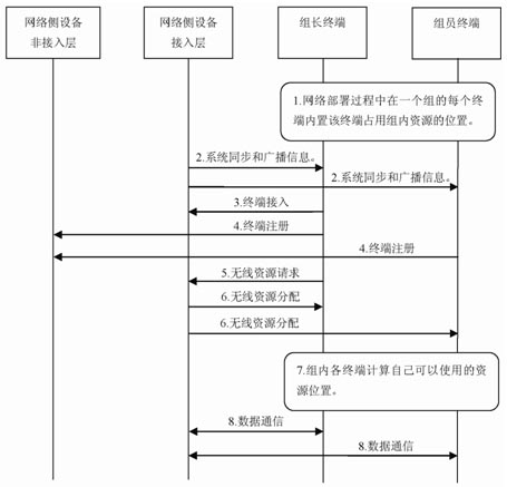 (6)網(wǎng)絡(luò)側(cè)設(shè)備接入層向組長(zhǎng)終端發(fā)布分配給該終端組的無(wú)線(xiàn)資源。