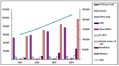 圖表:亞太地區(qū)電信市場2001-2004年收入狀況