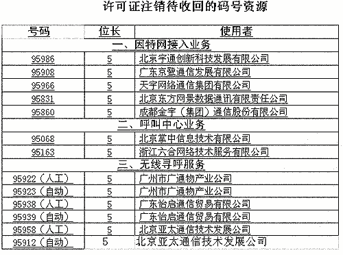信產(chǎn)部公告稱,對(duì)這次經(jīng)營(yíng)許可證注銷涉及的13個(gè)號(hào)碼,將依據(jù)《電信網(wǎng)碼號(hào)資源管理辦法》(信息產(chǎn)業(yè)部令第28號(hào))將予以收回。(高飛)