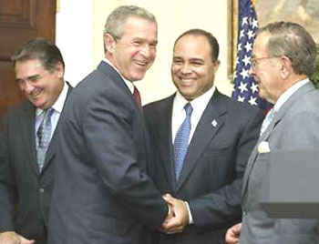 本周,美國50家電信公司中的一部分發(fā)起支持一個全美的網(wǎng)絡(luò)電話政策,并將它們的意見提交給了FCC(美國聯(lián)邦通信委員會),該委員會正在研究是否推翻當前許多規(guī)范VoIP電話撥號形式的努力。(圖為:布什和FCC主席邁克爾·鮑威爾握手)