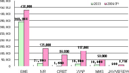 短信業(yè)務(wù)是各類移動增值業(yè)務(wù)中用戶量最多的新業(yè)務(wù),2003年已達到1.4億,WAP、IVR和CRBT業(yè)務(wù)2004年都取得高速增長。其中WAP用戶規(guī)模達到2500萬,其市場規(guī)模由2003年的1.8億元增長為2004年的11.7億元。