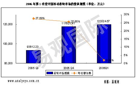 新華美通消息:易觀國際研究表明,2006年第一季度,CRBT 業(yè)務(wù)整體市場規(guī)模達(dá)到16億元,環(huán)比增長率為5%,增長速度較上個季度大幅度下降,業(yè)務(wù)已經(jīng)進(jìn)入低級飽和期。其中中國移動的彩鈴業(yè)務(wù)的市場規(guī)模環(huán)比增長率僅僅為2%,如果扣除中國移動和中央電視臺合作進(jìn)行的春晚彩鈴業(yè)務(wù)收入,中國移動彩鈴業(yè)務(wù)市場規(guī)模實(shí)際略有下降。圖:2006年第一季度中國移動彩鈴市場規(guī)模