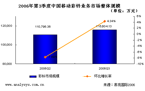 研究表明,2006年第3季度,CRBT業(yè)務略有反彈。其中移動彩鈴業(yè)務的分帳前信息費接近16000萬元,較上個季度小幅度反彈2.6%。但是總體上仍然呈現(xiàn)徘徊態(tài)勢,并沒有走出低級飽和區(qū)。易觀網(wǎng)