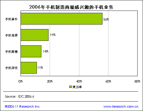 iResearch艾瑞市場咨詢根據(jù)IDC統(tǒng)計數(shù)據(jù)顯示,2006年手機制造商最感興趣的手機業(yè)務(wù)情況,手機音樂是手機制造商最感興趣的業(yè)務(wù),提及率達到56%,然后依次是手機電視19%、手機郵箱14%以及手機游戲11%.艾瑞市場咨詢