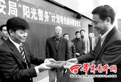 昨日下午2時(shí)許,重慶市公安局“陽(yáng)光警務(wù)”特約顧問(wèn)聘請(qǐng)儀式上,重慶市公安局副局長(zhǎng)、政治部主任彭長(zhǎng)健頒發(fā)了特約顧問(wèn)聘書(shū)。重慶市社會(huì)科學(xué)院研究員孫元明等18人成為我市警方首批聘請(qǐng)的“陽(yáng)光警務(wù)”特約顧問(wèn)。他們將作為警方的“智囊團(tuán)”直接參與、監(jiān)督警務(wù)活動(dòng),聘任時(shí)間為兩年。