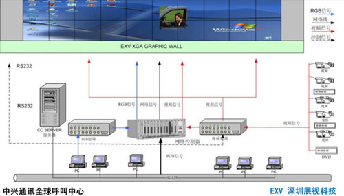 中興通訊股份有限公司是中國通訊設備制造領域最大的上市公司,正在實施的全球呼叫中心工程為了滿足中興通訊股份有限公司業(yè)務發(fā)展的需要,實現(xiàn)呼叫中心的網(wǎng)管自動化及完善中興通訊全球一體化服務體系,中興通訊的全球呼叫中心選用的是EXV公司的DLP大屏幕拼接墻產(chǎn)品。 該大屏幕拼接系統(tǒng)是由2*10 60″DLP大屏幕顯示系統(tǒng)、LED電子顯示系統(tǒng)及PDP等離子顯示系統(tǒng)等三部分組成。DLP大屏幕投影顯示系統(tǒng)選用