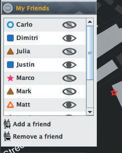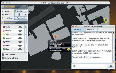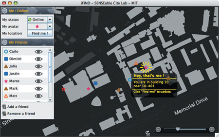 該軟件名為iFind,乍一看類似任何典型的即時通信軟件,也需要雙方相互邀請,這樣才能進入對方的好友名單。用戶可以選擇暫時隱藏起來,不讓某個好友或者整個群組看見自己,他們還可以完全把某人從好友名單中刪除。不過iFind的好友名單增加了地圖,可以實時顯示這些朋友在MIT校園的哪個角落。地圖顯示了通過Wi-Fi登錄到MIT網絡上的好友,讓用戶可以為每個朋友創(chuàng)建獨特的迷你頭像,能看到誰在學校河邊閑逛、誰在樓上圖書館看書。