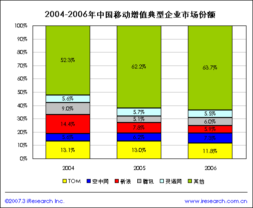 iResearch艾瑞市場咨詢最新的研究成果顯示,2004-2006年,在中國的移動(dòng)增值市場中,TOM、新浪的市場份額處于不斷下降的趨勢,其中下降最明顯的是新浪網(wǎng),它的市場份額已由2004年的14.4%下降到2006年的5.9%,但與此同時(shí)空中網(wǎng)的市場份額卻處于增長趨勢,已由2004年的5.6%增長到2006年的7.3%.艾瑞市場咨詢(iresearch)